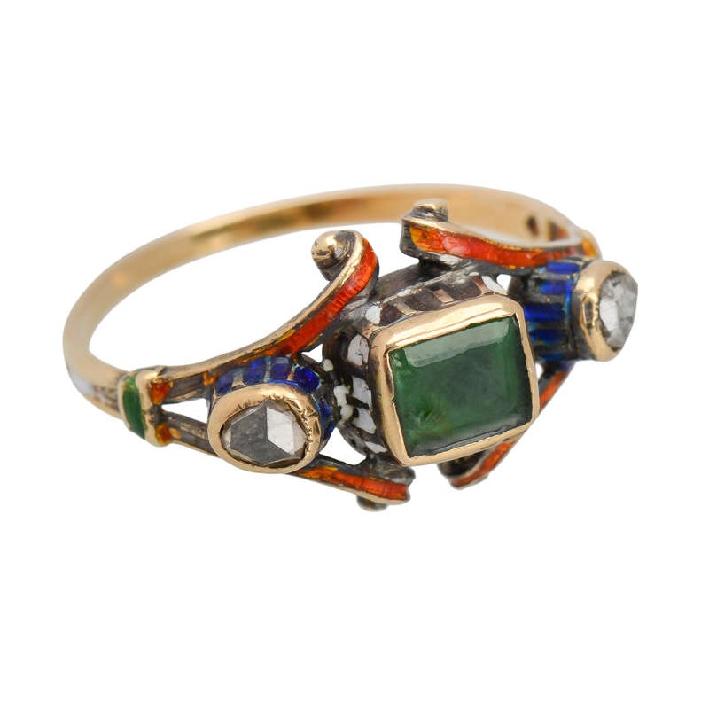 On each side, two rose-cut diamonds are also bezel set with royal blue enamel arches beneath. Scrolling ends rest to the north and south of the emerald. These are adorned with a burnt orange enamel; then taper down, melding to one smooth shank. More enamel of green and white decorates those surfaces.