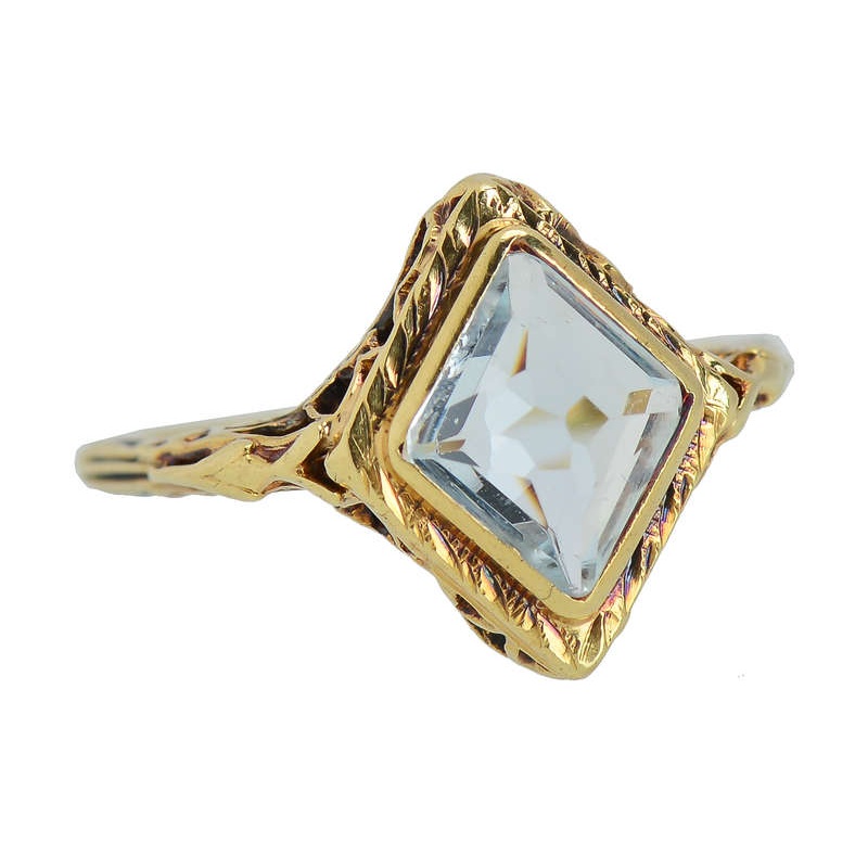 This Art Deco ring, while set with an aquamarine, has a Renaissance air about it. Why? The aquamarine is set upside down so that the point is upward. With its pale coloration, and when worn, it almost resembles a pointed cut diamond.