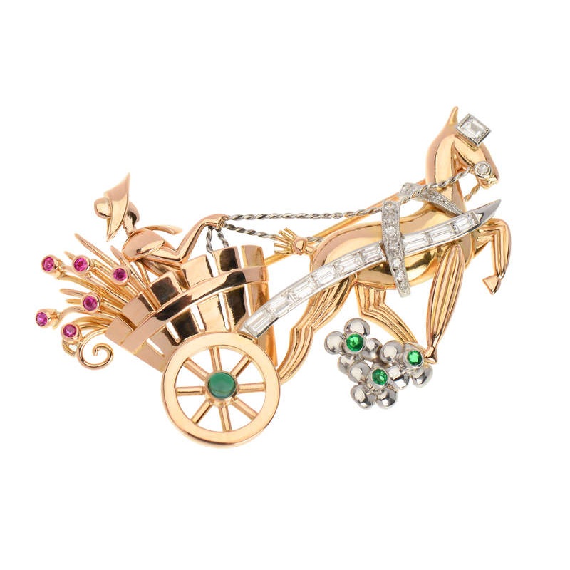 SPECIAL MARKDOWN. Exceptional Value.With a certain note of whimsy, this vintage Retro-era brooch takes us for a ride.Created in 18k rose gold and with added touches of white gold, the theme is an old-fashioned donkey cart and driver. Utilizing a blend of a