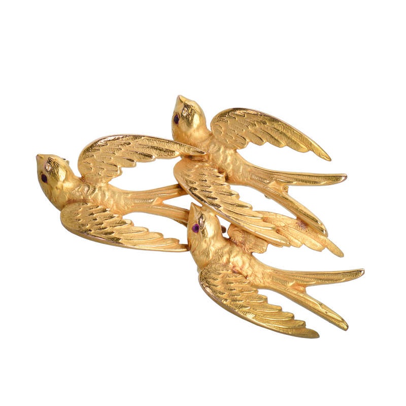 Three textured gold avians soar in tight formation. Highly realistic, their feathers and plumage as well as their forked tails are discernable, all direct upward in flight. A ruby eye dots each head.