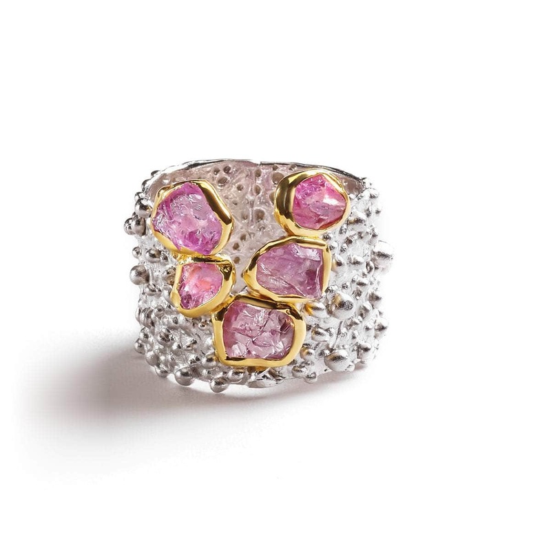 Texture and undulations have been unleashed in this pretty ring. Handcrafted by artisans who understand the raw beauty of their materials the raw ruby gemstones speak their truth for all to see. Trimmed delicately in gold they glisten and capture light ete