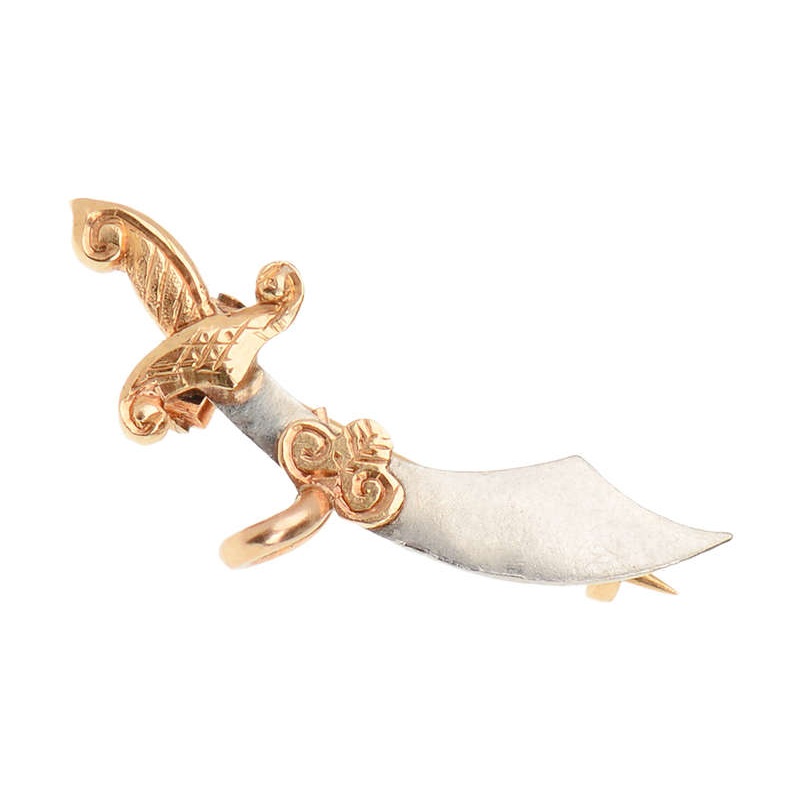 Tiny, it is remarkably detailed. In 14k rose gold and white gold, the hilt shows linear patterns as if wrapped, the curved guard is engraved as well. Its white blade broadens at the end with a concave double point.