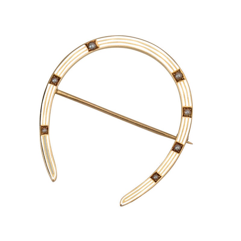 Good luck takes the form of a signed Riker Brothers horseshoe brooch.Yellow gold of 14k combines with delicate ivory white enamel bands and diminutive half natural seed pearls. Contact us to easily convert this to a pendant or necklace.