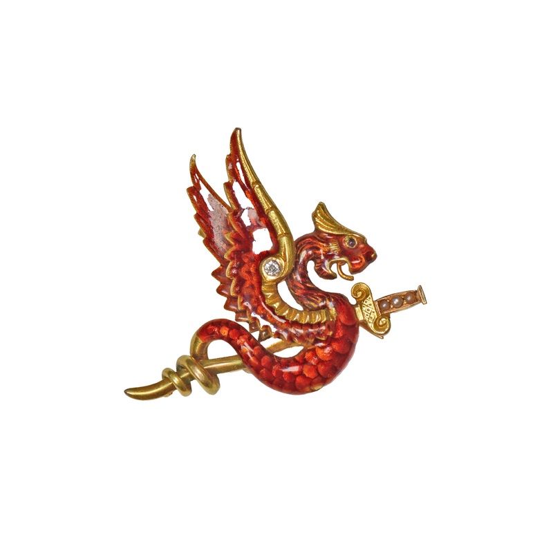 Description: One Riker Brothers antique Art Nouveau red enamel dragon motif brooch with a diamond,seed pearls, and a ruby. Watch hanger fitting.