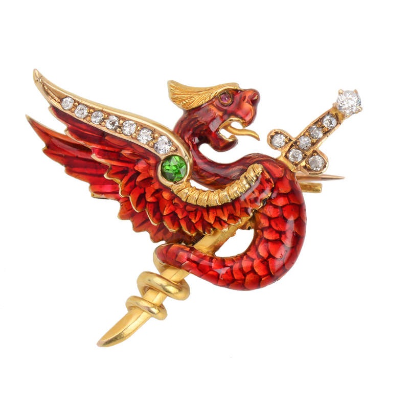 One of the more notable and identifiable motifs offered in a variety of sizes by the Riker Brothers is that of the dragon brooch. Their detailing, texturing, and modeling were on par with that of Tiffany.
