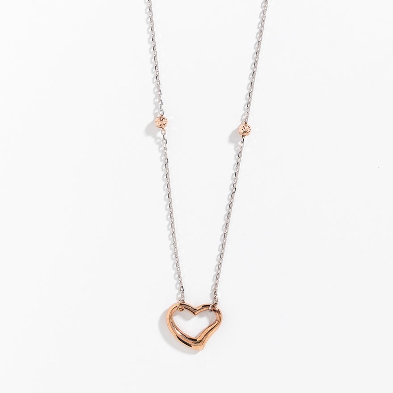 This charming necklace has a wonderful design that youll be sure to adore. It showcases an open heart pendant that is finely crafted in 10K rose gold and is paired with an 18 10K white gold beaded chain with a diamond cut pattern.