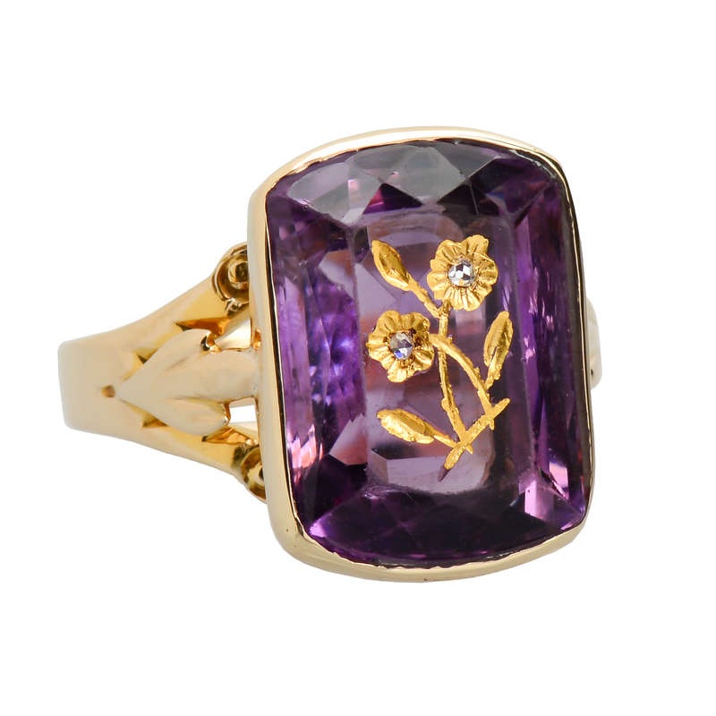 The image of a pair of flowers, complete with stems and leaves, has been carved into the surface of a lush, deep colored amethyst of 6.8 carats. A graceful shape, it is a twist on a rectangle but with arched, convex ends. The amethyst balances between a ri