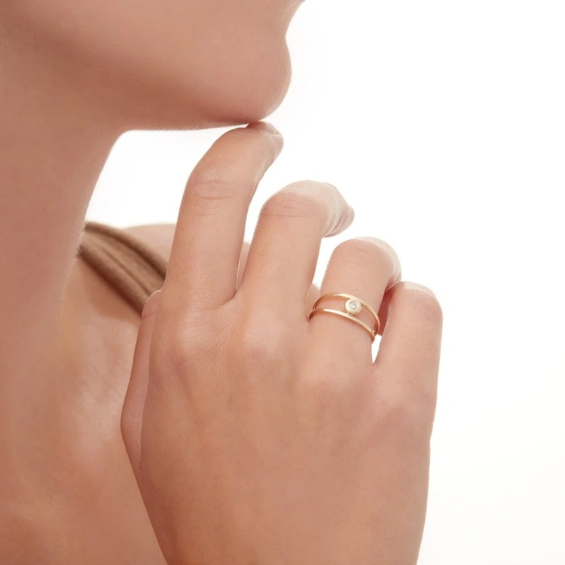 Delicate dimension made to be seen. A classic round bezel with the unique MM twist – a wider frame of gold surrounding the diamond – balanced between two round wire shanks, the Round Bezel Double Shank Ring is effortless yet distinct.