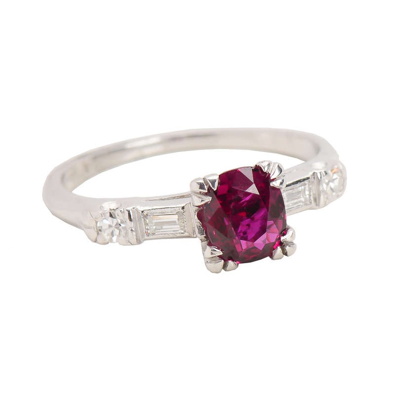 A tailored ruby and diamond five-stone vintage ring employs platinum for the foundation. With a carat weight of 1.06 for the gemstone, and .24 carats of diamonds, it can be presented as an engagement ring, or worn as a right hand ring with equal aplomb. The diamond color is G-H and they have a clarity of VS.