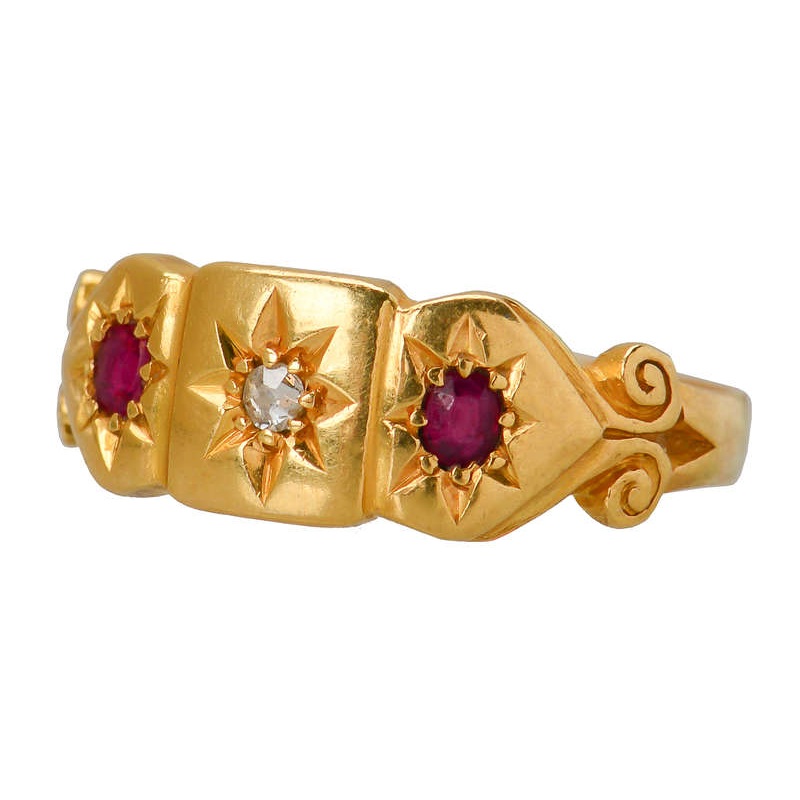 Dating to circa 1900, this English ring holds a diamond and two natural rubies. Both are set beneath the surface of the gold and within a star pattern.