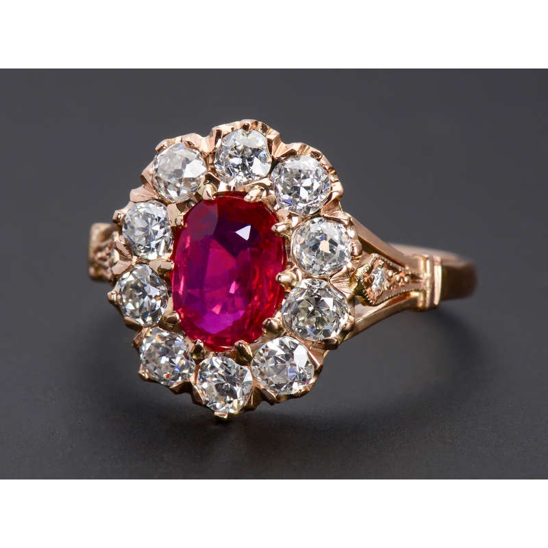 A traditional cluster ring is centered with an oval cut, natural red ruby of indescribably crimson presence. Clear, resonant, and glowing it is not to be outdone. Rarely do we find this gemstone with such a fine clarity that you can see to the bottom of the stone.