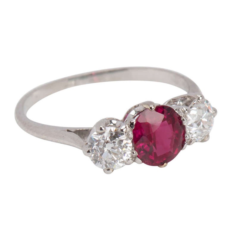 Two old European cut diamonds pair their whiteness against the carmine goodness. A total of .85 carats (color G-I, clarity VS2-SI1) of antique diamonds create this east west classic ring.
