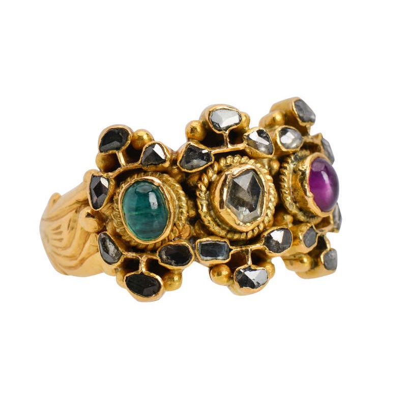 A natural cabochon emerald opposes a ruby with a rose cut diamond between. Another eighteen rose cuts glint silvery sheen imbedded in gold.