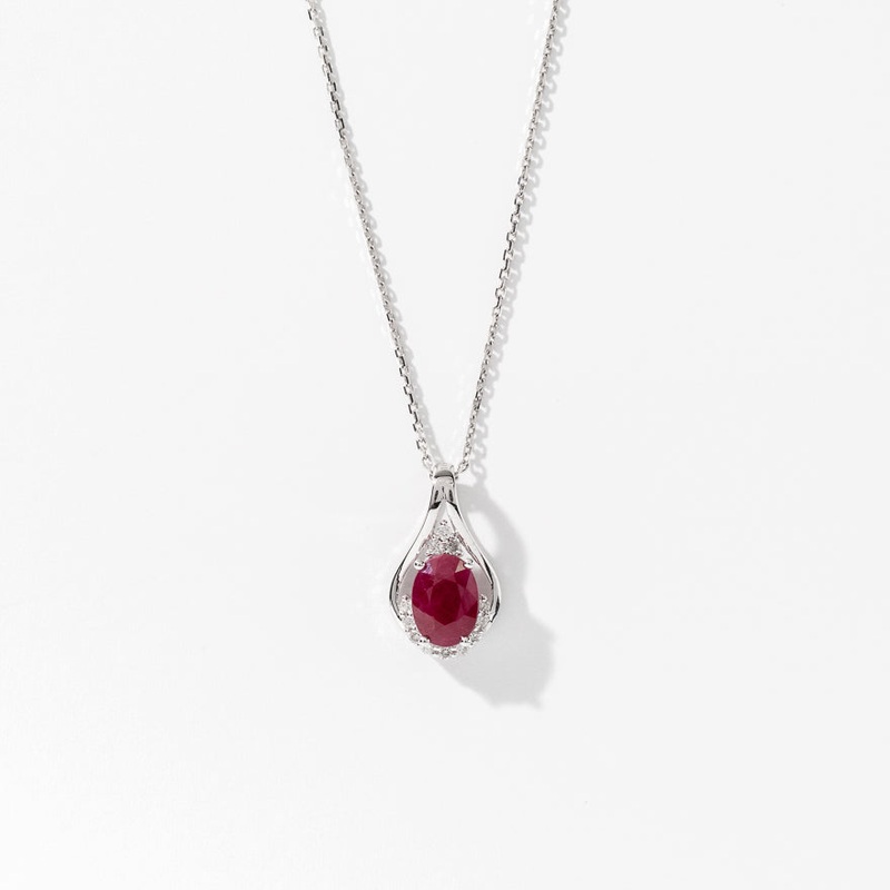 Make a bold statement with this stunning ruby pendanta timeless treasure shell cherish. Expertly crafted in radiant 10K white gold, it features a captivating 7x5mm oval ruby at its heart, surrounded by the sparkle of 12 round brilliant diamonds. Complete with a matching white gold chain, this elegant piece celebrates the ruby, Julys birthstone, making it a perfect gift for any occasion.