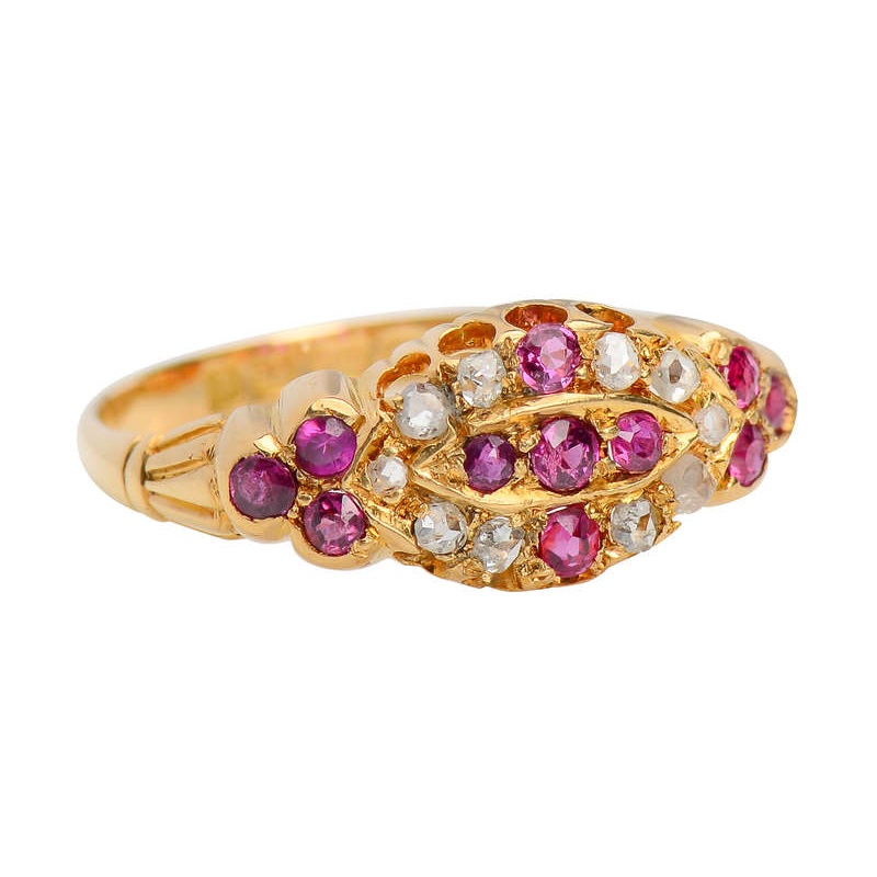 Arched across the finger rests natural vivid red rubies and antique rose cut diamonds. A harmonious chord is stuck in its unusual design. Low in profile, or sitting very low on the finger, it is perfect for today's active lifestyle. English in origin, fort