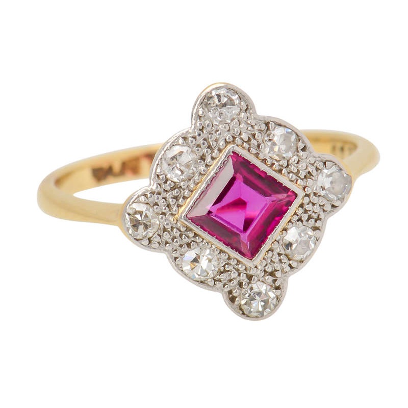 Geometry class is in session and was never quite so much fun. A true ruby red ruby is square in shape, and set point end up. Framed in platinum and diamonds, the edges are softly sculptured and scalloped. Dimpled and textured, the surface near the diamonds