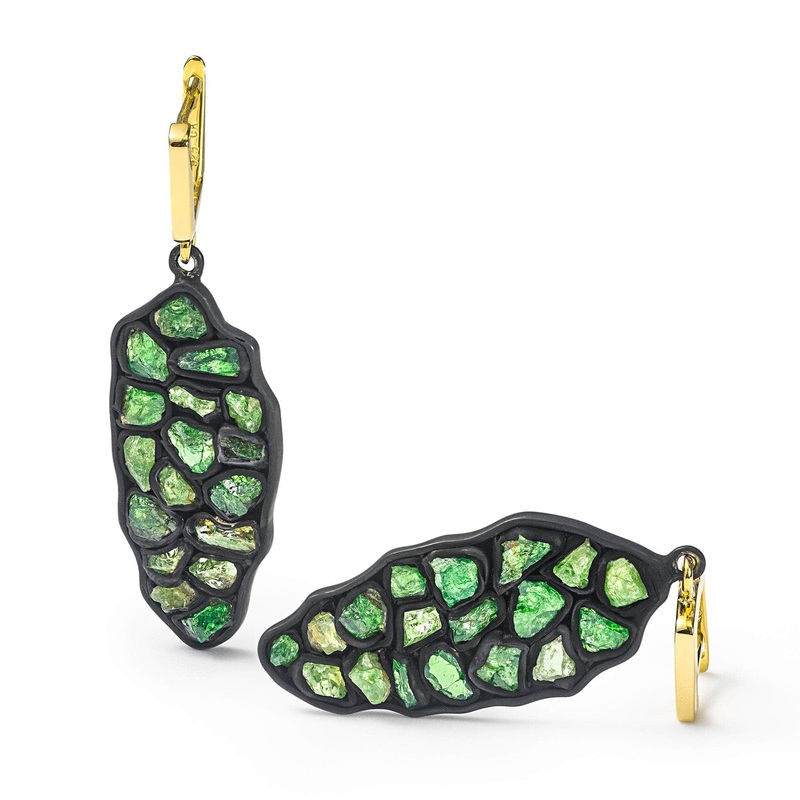 This pair of designer earrings showcases ‘s hallmark Stained Glass technique, where natural, irregularly shaped gemstones are connected by silver wrappings to create a colorful kaleidoscope effect. Crafted from 925 Silver and plated with 18K Gold and Black Anthracite, these slightly asymmetric earrings offer a dark, contrasting aesthetic along with comfortable, allergy-free wear. Featuring natural raw Tsavorite garnet crystals in their pure, untreated state, these earrings connect wearers to the wild, untamed forces of nature.