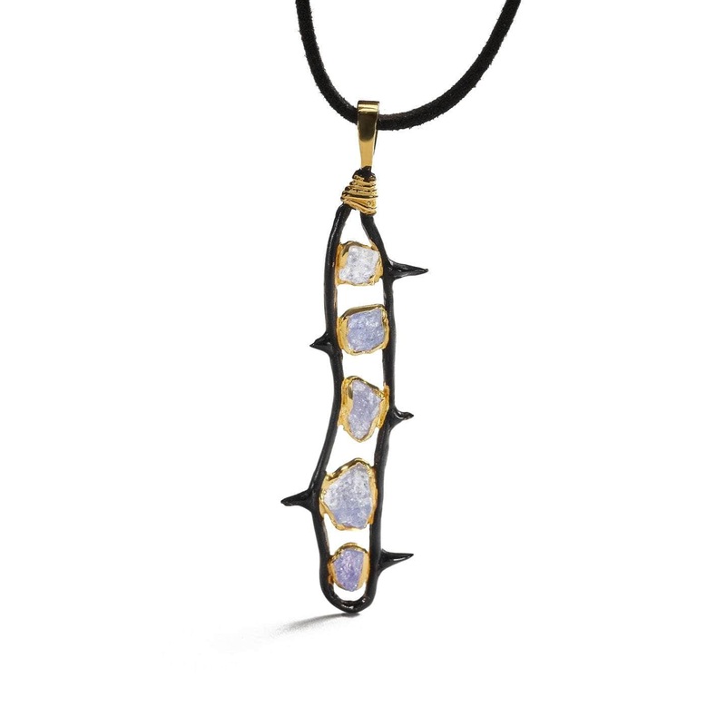 A twisting line of precious metal forms a special casing for a series of gorgeous raw tanzanite gemstones. Black anthracite has a depth of majesty that pervades the entire design. Thorn-like details add further dramatic texture.