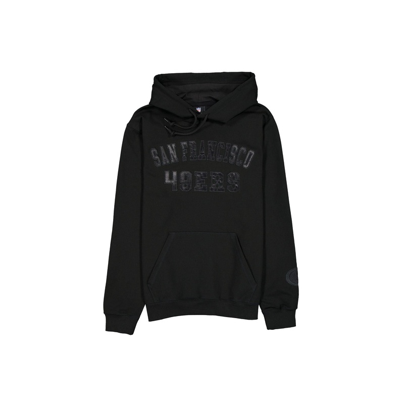 The San Francisco 49ers Black on Black Logo Select Hoodie features a satin applique with a tonal stitch 49ers wordmark at the chest and an embroidered team logo at the left-wear sleeve.