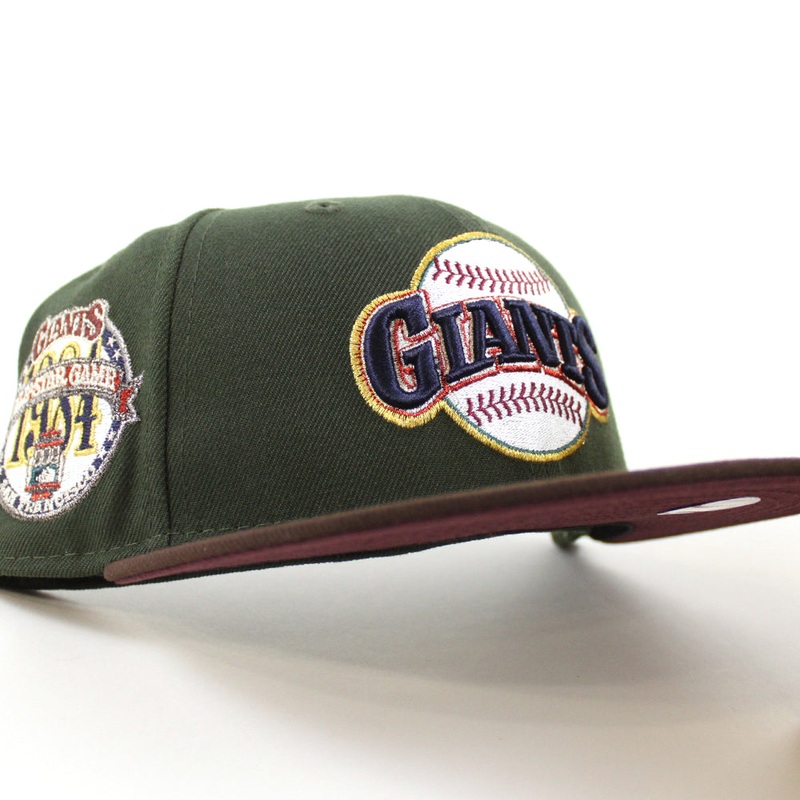 San Francisco Giants 1984 All Star Game New Era 59Fifty Fitted Hat in SeaWeed Green, Burnt Wood and Maroon Under Brim.