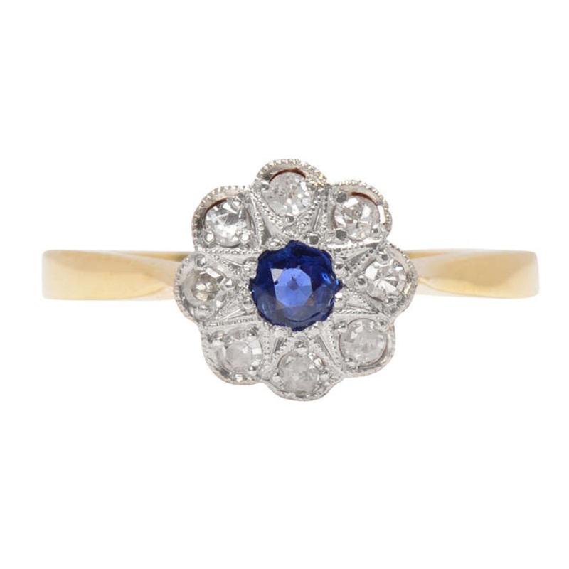 A sapphire dots the center of the flower or scalloped cluster of diamonds in this Art Deco era engagement or right hand ring.