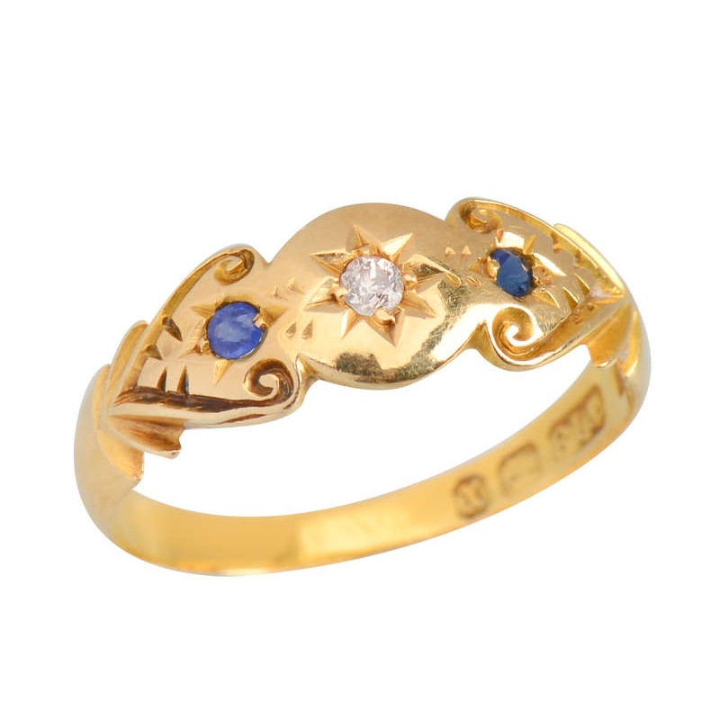Two beautiful natural blue sapphires and an antique old European cut diamond are gypsy set into patterns on the sides, and a star for the diamond.