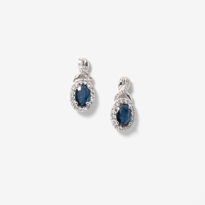 Experience the allure of these stunning earrings. Finely crafted in 10K white gold, each piece features a captivating oval 6x4mm sapphire. Surrounding each sapphire are 21 dazzling diamonds, meticulously set to enhance their brilliance and create a breathtaking sparkle. Finely crafted with precision, these earrings are a statement of timeless beauty and refined luxury, perfect for adding a touch of glamour to any ensemble.