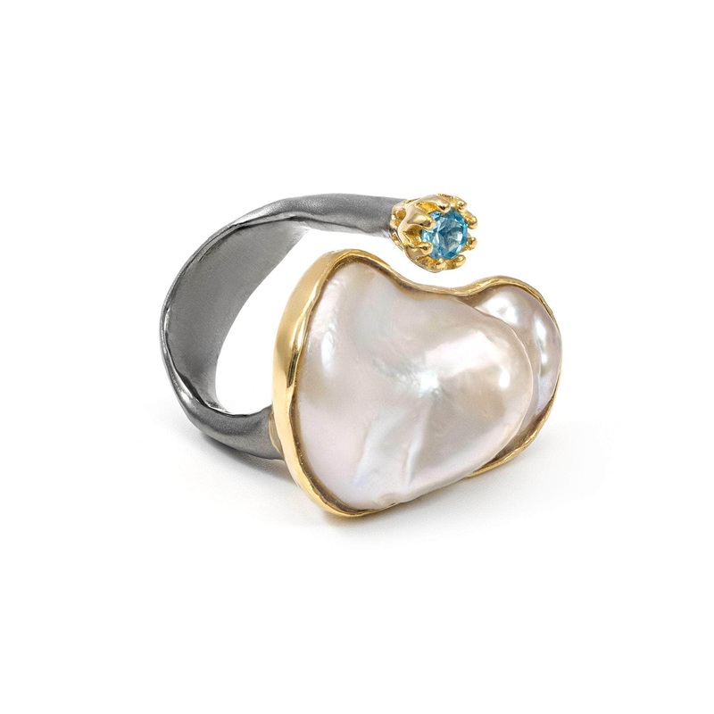 This ring is an artistic creation, merging 925 Silver with a plating of Black Rhodium and 18K Gold. It showcases a Baroque Pearl, celebrated for its unique and organic shape, alongside a small, round-cut Blue Topaz dot that injects a burst of vibrant blue