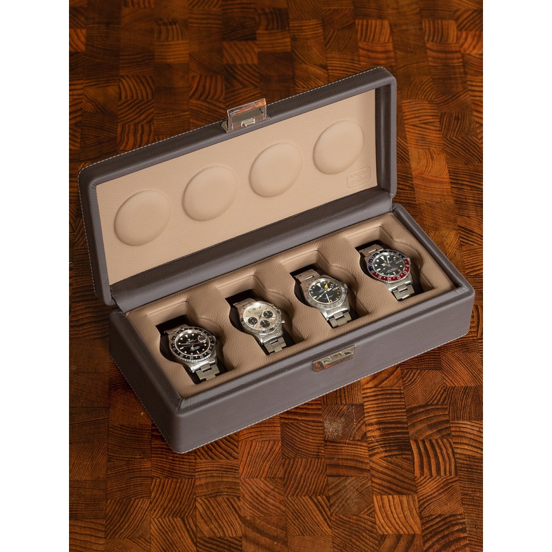 The Valigetta 4 is the brands storage solution for your 4-piece collection. Like all Scatola del Tiempo products, this elegant and sleek travel case is made from the finest leather and is 100% Handmade in Italy. Featuring safe storage for up to 4 watches with bubble-padded tops that securely hold your piece and prohibit movement during transportation.