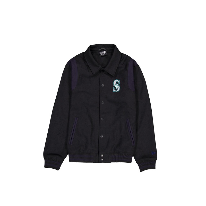 The Seattle Mariners Sport Night Jacket features an embroidered Mariners logo at the left chest with a snap button closure and a twill applique team wordmark at the rear.Fabric: 90% Polyester, 10% Wool