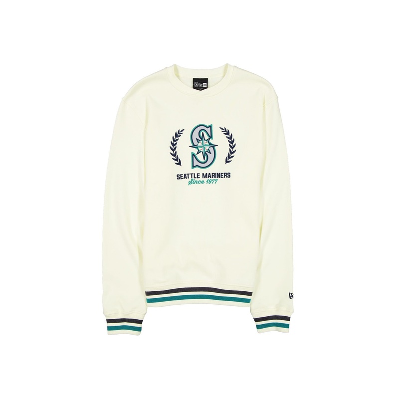 The Seattle Mariners Throwback Chrome White Crewneck features a twill applique Mariners logo and an embroidered wordmark at the front with a New Era jock tag at the left hip.
