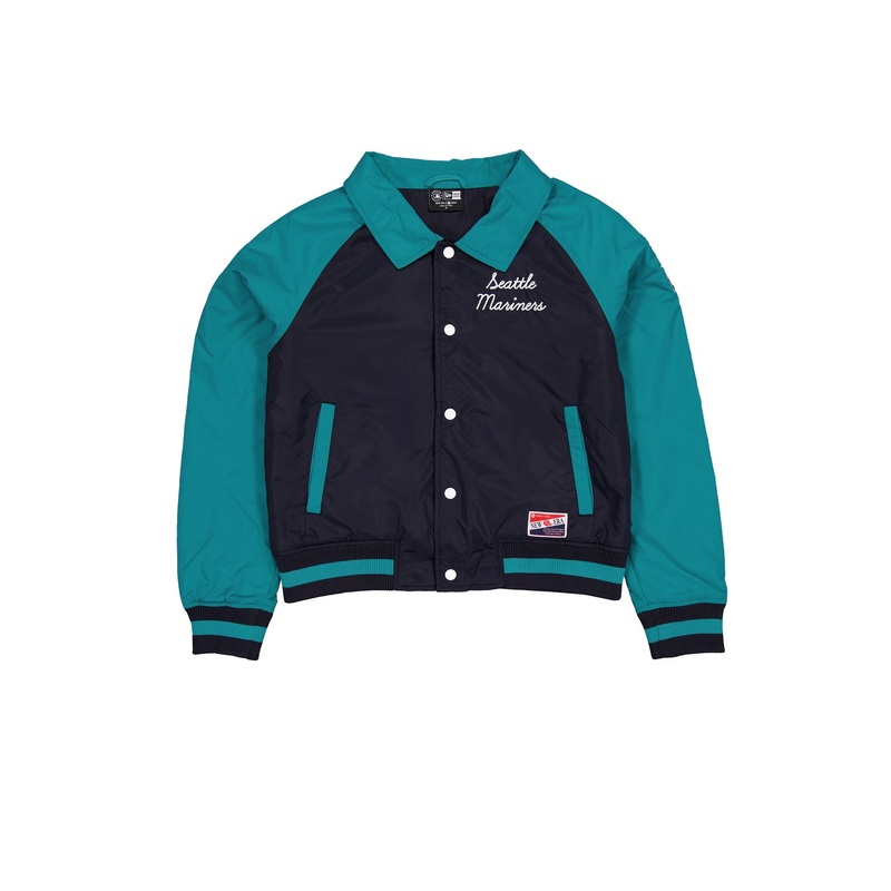The Seattle Mariners Throwback Women’s Jacket features an embroidered Mariners script at the left chest with a chenille team logo and wordmark at the rear and a sherpa interior lining.