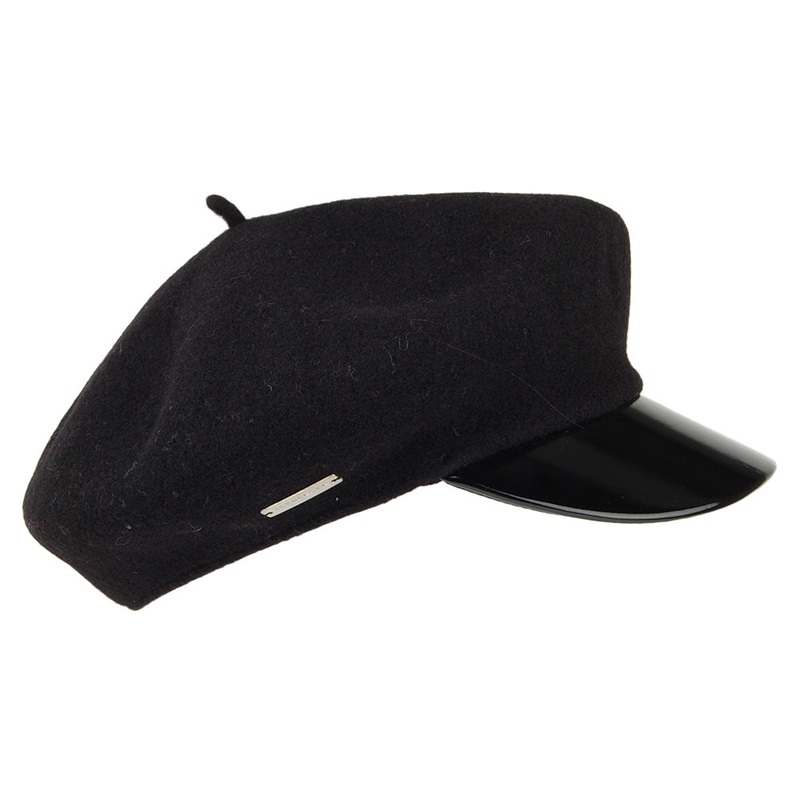 This is the Wool Baker Boy Cap from Seeberger in black. This beautiful cap has a 100% woolen crown and a peak in shiny vinyl optic. On the side is a small metal Seeberger logo featured. The cap is unlined and there is a sweatband in the inside for extra co