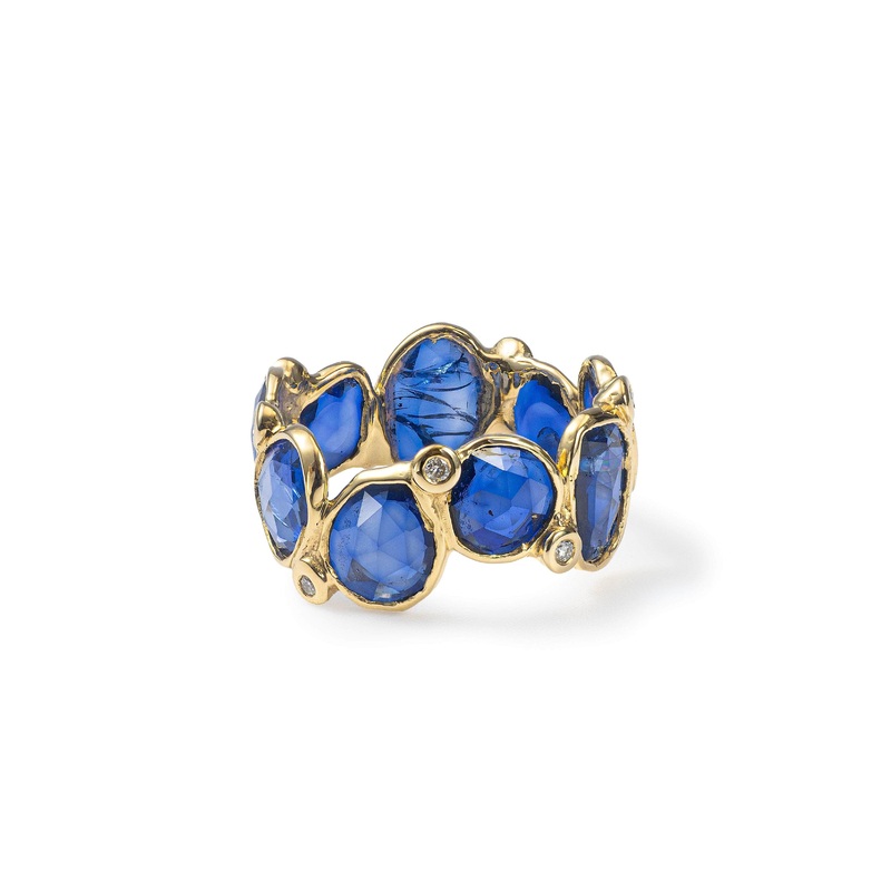 Introducing a standout piece from ‘s Gold Collection: a unique ring made from solid 14K Gold, featuring fancy-cut Blue Sapphires and scattered Diamonds. The intense color of the sapphires is achieved through special treatment. Following the Vedic belief that gemstones must touch the skin to work their magic, this ring is designed to harness the stones’ energy. Each ring is handmade, reflecting the individual shapes of the sapphires and ensuring no two are alike. Available on demand in your size.