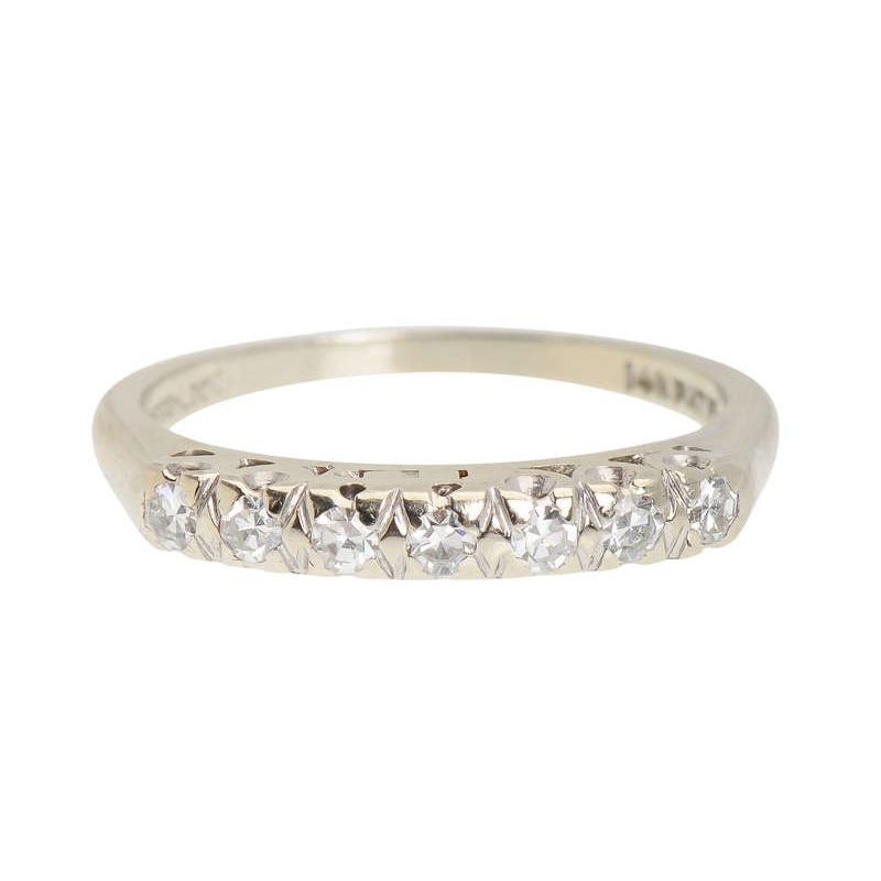 An eco friendly and conflict free classic, 7 diamond wedding ring or band pairs with a multitude of engagement rings. Lovely single cut white diamonds at G-H color and a crystal clear clarity of VS add up to .14 carats. Flat prongs create a look that will