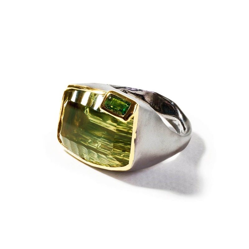 At the heart of this contemporary jewelry piece rests a large, all-natural octagon-cut green amethyst. A dark-olive, intense-green baguette-cut tourmaline sits atop the green amethyst, adding an unexpected contrast. The ring’s peculiar design sets it apart from mass-produced jewelry, elevating it to the form of wearable art. Besides, this modern design holds extra artistic and collector’s value due to its singularity status.