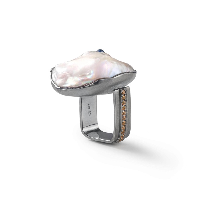 This designer ring, a blend of classic and edgy style, is crafted from 925 Silver and coated with luxurious Black Rhodium from the Platinum metal group. At its center sits an irregularly shaped Baroque Pearl, its warm, organic luster bringing the piece to life. Accented with vibrant Yellow and Blue Sapphires, the ring resembles a living, breathing entity a peculiar jewelry creature in search of a human companion.