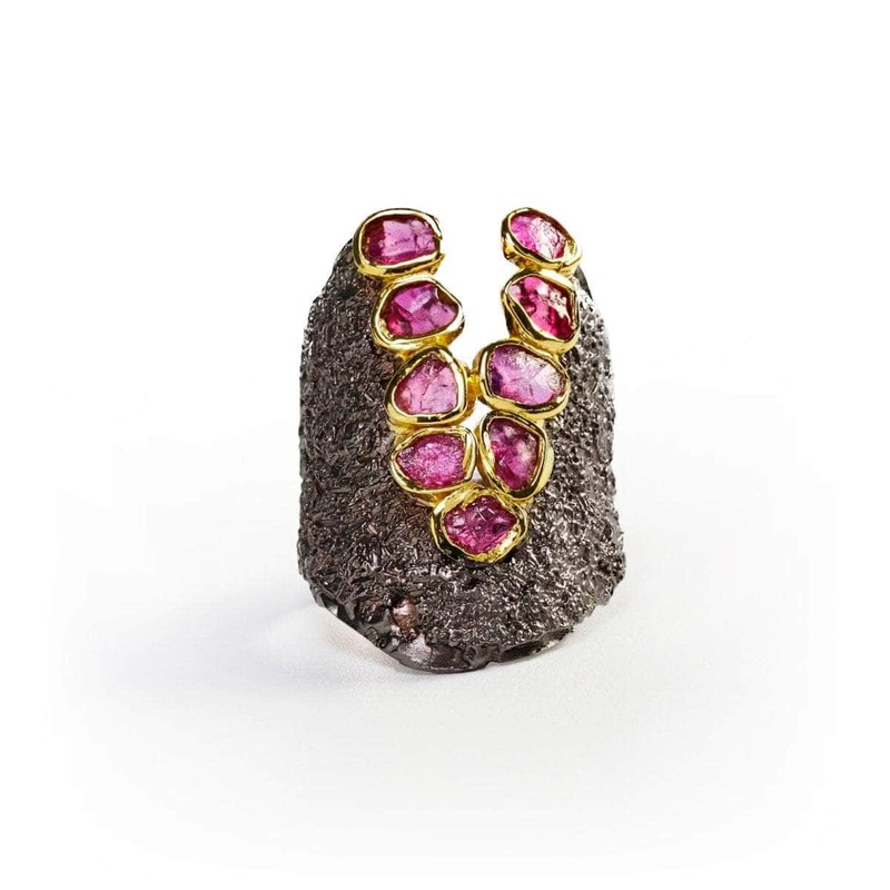 A raw terrain of black rhodium creates a backdrop of drama and texture. A deep cleft of rough ruby gemstones offer a powerful element of dark light. A trim of pretty gold trims around each jewel.