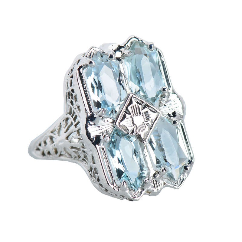 A chic Art Deco ring of 18k white gold filigree stars four fancy cut aquamarine gems, total of 2.4 carats. Each of the gemstones is set in a quadrant on the face of the mounting. Centered in a flower like engraved diamond shape.