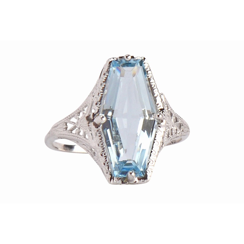 From the Art Deco period, the setting rests low on the finger. A modern aquamarine is a sensation.