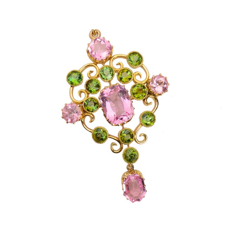 Alive with color, this Edwardian era pendant meets the eye with peony pink and grass and forest greens. Created in three parts, a top bale, a middle section, and a drop, it is studded with tourmalines. The setting was created in 15k yellow gold and the pin