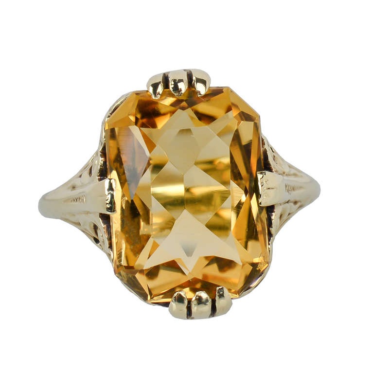 Its weight is 3.6 carats of sparkle, far more than many citrines. Set into 10k yellow gold filigree, the open area beneath the gemstone is alive with swirling, wavy designs.