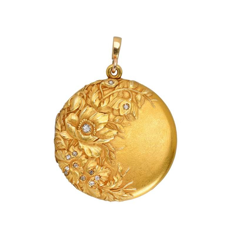 Several varieties of flowers, amid a flurry of leaves, hug the left half of the circular locket. These leaves wrap around the edge and hug the left side of the reverse.
