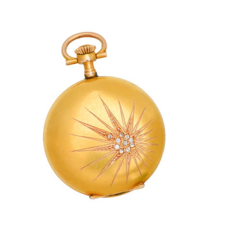 Both a working antique Swiss watch and a radiant pendant, the front gold cover displays a 20 pointed rayed star.
