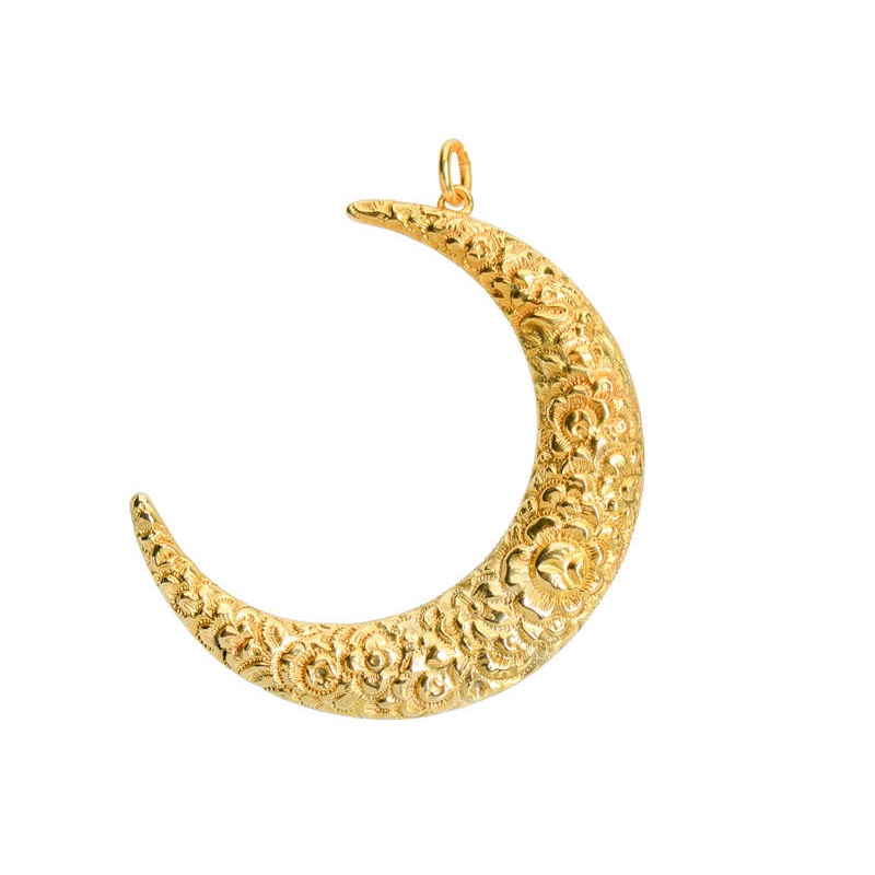 Circa 1910, this evocative gold textured crescent moon brooch calls up images of the starry night sky. All in 14k gold puffy and hollow, the front surface texture reveals roses and flowers in an all over raised surface of blooms. A medium to larger scale,