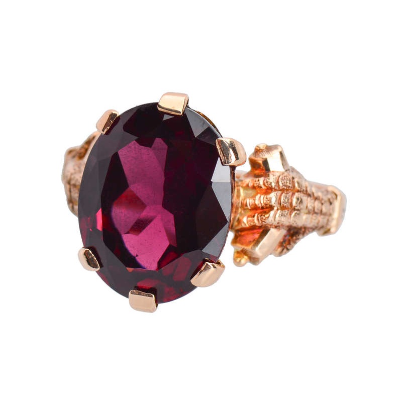 A radiant deep, claret and plum hued oval garnet of 13.7 x 10.7 mm or 7.10 carats in weight strikes a mesmerizing chord and holds attention. Not to be outdone, the 14k rose gold setting features two scaled talon claws on each of the shoulders gripping a baton.
