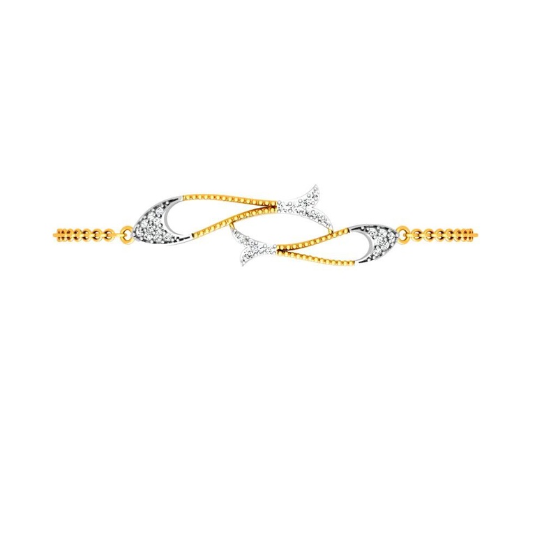 This 18K diamond gold bracelet for women has two fish design studded with 0.25CT diamonds that comes with SGL/EGL/PCC CERTIFICATION. The bracelet is made up of BIS hallmark gold that has a dimension of 4.5cm*5.6cm*4.5cm and weights 3gms only.