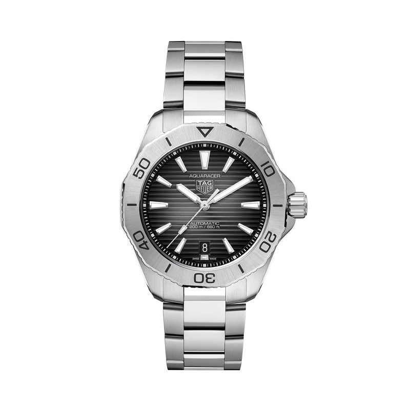 Stand out with this TAG Heuer Aquaracer showing a smokey black mother of pearl dial set with 11 brilliant-cut VS diamonds. The optimal ergonomics and finishes of this 30mm steel case raise the bar, and are set to endure any conditions, while the tapered br
