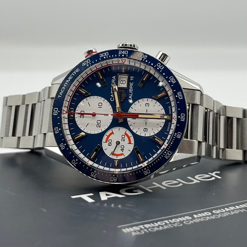 The TAG Heuer Carrera Chronograph with a blue dial is a distinguished timepiece that combines sporty functionality with refined aesthetics. Encased in polished stainless steel, the watch features a 41mm case that houses a vibrant blue dial. The dial is adorned with three sub-dials for chronograph functions, a date window at 3 o’clock, and is protected by a scratch-resistant sapphire crystal. Powered by the Calibre 16 automatic movement, it offers a 42-hour power reserve. The watch is complemented by a three-link stainless steel bracelet, secured with a deployant clasp.