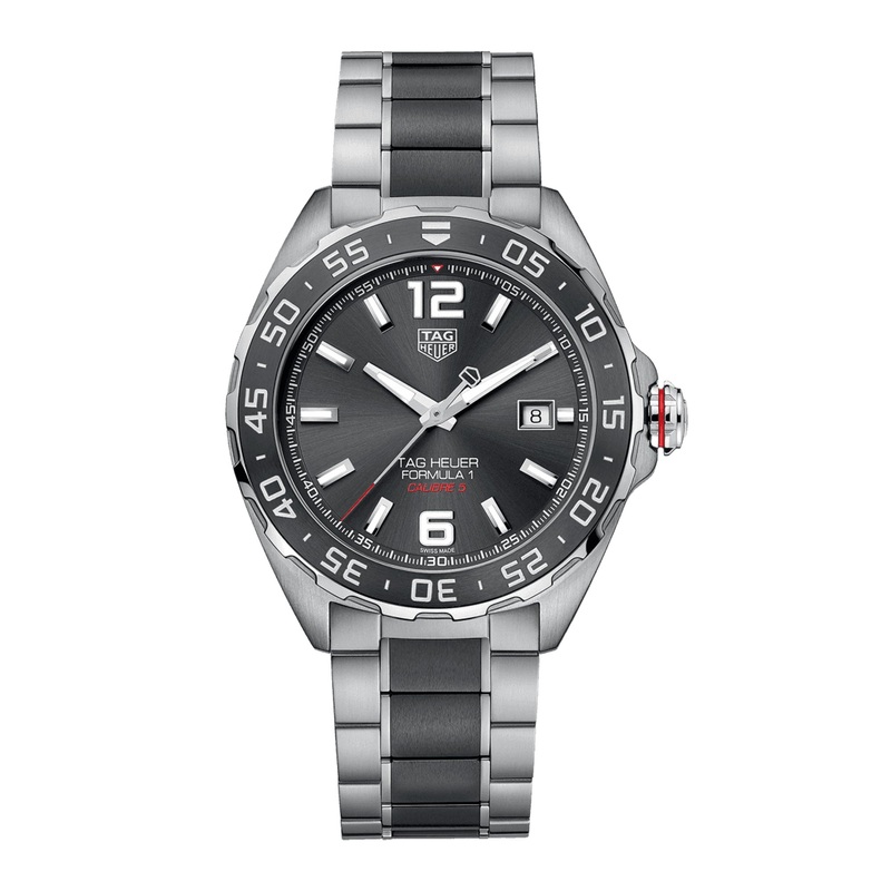 DESCRIPTIONThis magnetic duo-toned steel and ceramic TH Formula 1 is the perfect introduction to the TAG Heuer world. It is the only collection that bears the houses iconic shield on the dial, which, here, is lustrous anthracite-colored with high-luminosit